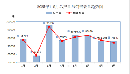 (1)2025年8月份再生胶、胶粉总产量76341吨(其中:普通再生橡胶46166吨,特级再生橡胶5399吨,特种再生橡胶8447吨,胶粉16329吨),同比下降3.61%,环比增长0.04%;销售量74453吨,同比下降5.47%,环比下降3.29%。8月份29家会员单位合计废旧轮胎处理量(折算)为87792.15吨。