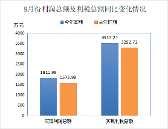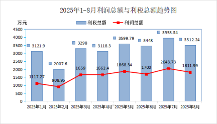 (3)2025年8月份实现利润总额1811.99万元,同比增长15.12%,环比下降11.34%。盈利企业27家;实现利税总额3512.24万元,同比增长6.67%,环比下降11.16%。