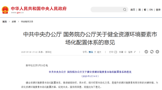 2025年5月14日,中共中央办公厅 国务院办公厅发布《关于健全资源环境要素市场化配置体系的意见》。意见指出,健全资源环境要素市场化配置体系,推进碳排放权、用水权、排污权等市场化交易,是提升资源环境要素利用效率的关键举措。2025年7月18日中共中央办公厅、国务院办公厅发布《地方党政领导干部生态环境保护责任制规定(试行)》。规定明确指出,实行地方党政领导干部生态环境保护责任制,坚持以习近平新时代中国特色社会主义思想为指导,完整准确全面贯彻新发展理念,牢固树立和践行绿水青山就是金山银山的理念,推动实现美丽中国建设目标。